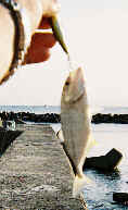 釣果:とりあえずメッキ(ギンガメアジ)を1匹ゲット 10cmぐらい… ルアー:MMミノー48mm(アユカラー) 釣行記: 「メッキを求めて電車でGO!」第2弾! 今度は房総半島を探ってみることに。 朝6:00に家を出発。 その後京葉線、内房線と乗り継いで、金谷漁港へ。東京湾フェリーの発着所でもある。 港近くのドライブインで昼食を済ませ、今度は外房へ。いろいろ迷った挙句、勝浦を目指す。 デカい漁港だ。マールアミーゴ6gでを遠投して、広く探ってみる。 その後もチェイスが頻繁にあるものの、乗せられず。 しかし、ここで一気に興奮が冷める出来事…。 釣れたメッキは結局小型1匹のみ。夕方、港内も探るが反応なし。 メッキのチェイスは結構あるが、乗せられるかは腕次第。 しかし今回、メッキ1匹のためにかけた交通費、高過ぎや…。 |