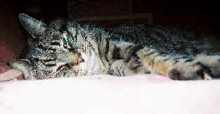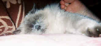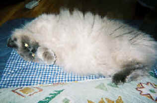 ストーブの前の暖かさで、ご機嫌なコムちゃん。 カメラを向けるとセクシーポーズ(オスなんですが…)。 でもやっぱり目は光る…。 |