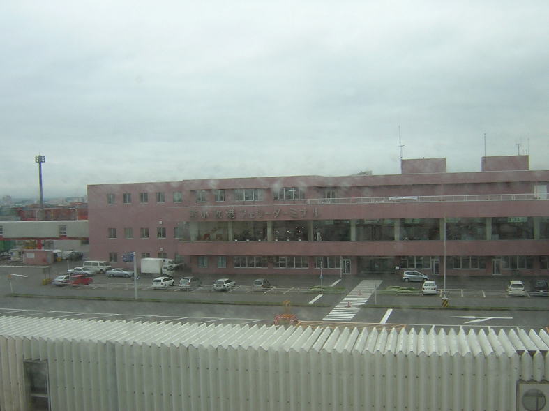| 苫小牧港に入港。 | フェリーターミナルは小雨模様…。 |