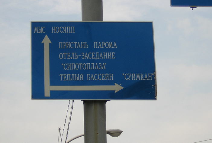 | 国境の町、稚内。 市内の案内標識にもロシア語の表記が目立つ。 |