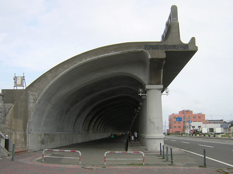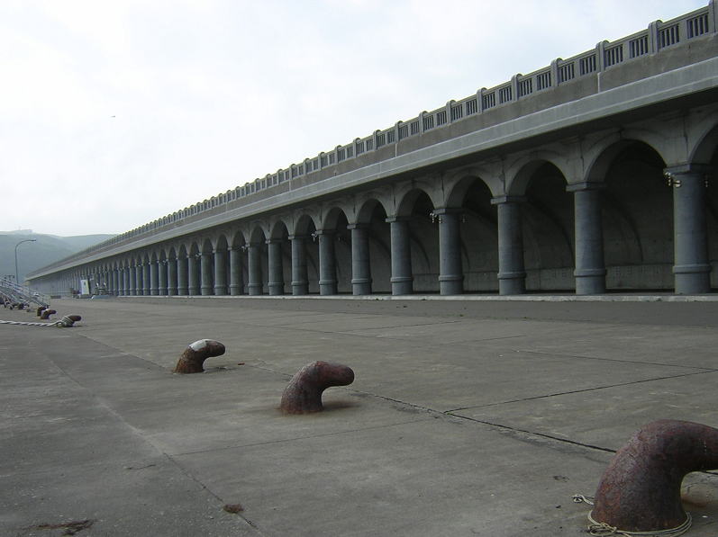 北防波堤ドーム。 昭和11年完成の歴史的建造物。 樺太航路の発着場までの線路を風波から守るために 建設された防波堤だそうだ。 ちなみに夜は、ツーリングライダーの皆さんの 野宿場になっています。 (私も、寝床が見つからなければ ここで泊まることを覚悟していた…) この建造物の詳しい解説はこちら(稚内市役所HP)。 |