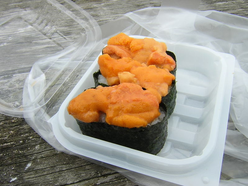 | 礼文島の名物は利尻昆布で育ったウニ。 これはスコトン岬の売店で売っていたウニ軍艦巻き。 3カンで1000円と、ちょっと高かったが味は格別。 |
