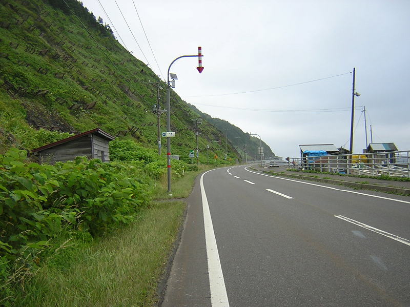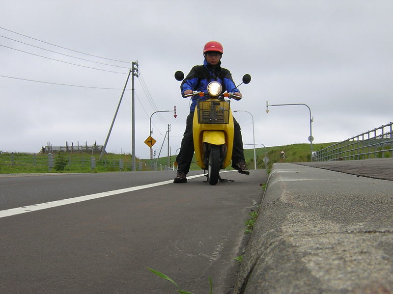 | 海岸沿いの道。 | 今日1日の相棒の原付と(なんか赤ヘルが微妙だ…)。 |