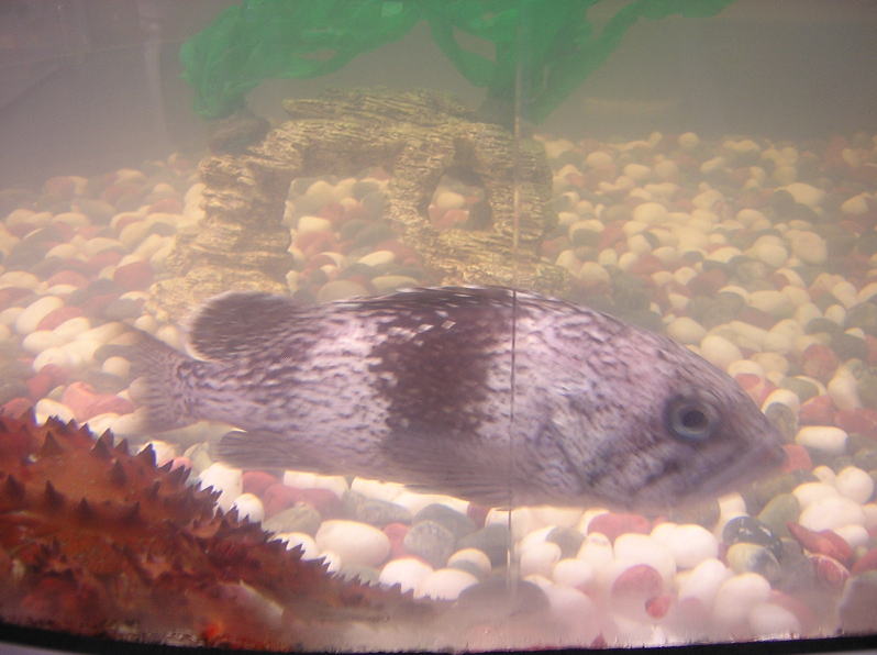 | 水槽内を泳ぐキツネメバル。マゾイとも呼ばれる。 左下は 花咲ガニ。 |