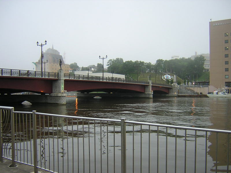 | 北海道三大名橋のひとつ、幣舞橋。 | 日が暮れるにつれ、霧が濃くなってきた。 なかなか幻想的である。 |