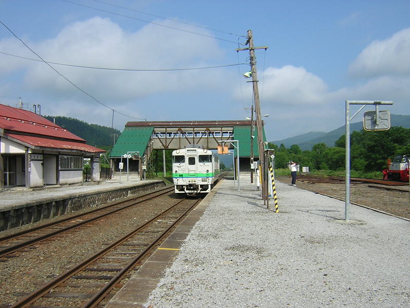 | 出発前の滝川駅。 | 途中の落合駅。 単線のため、列車行き違いのための停車を繰り返す。 見えにくいが、運転手さんも外でタバコ休憩中。 |