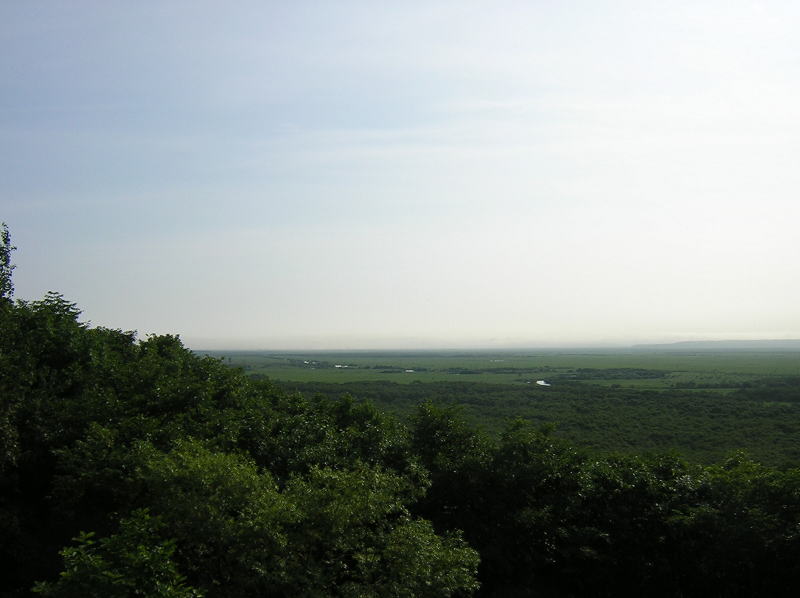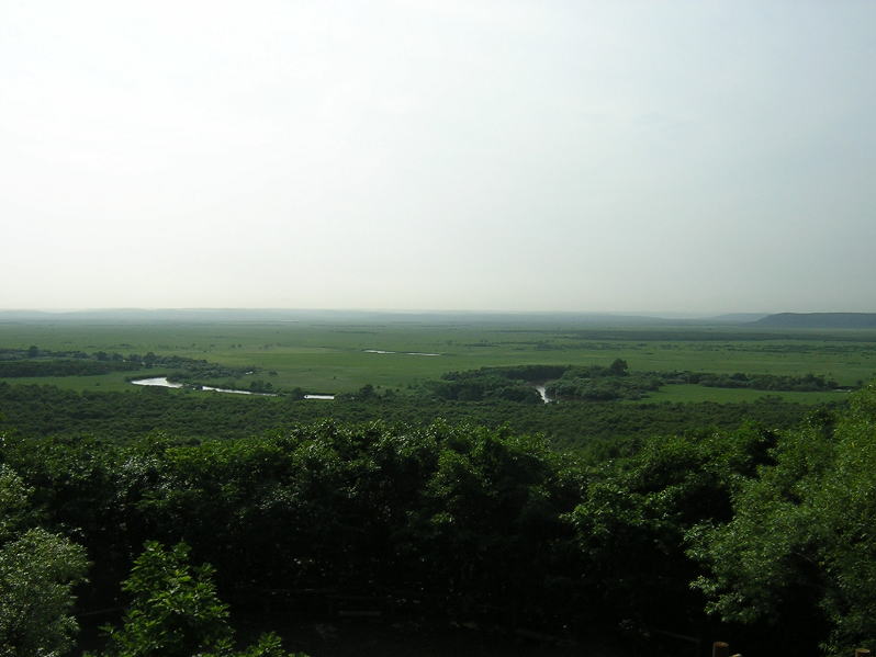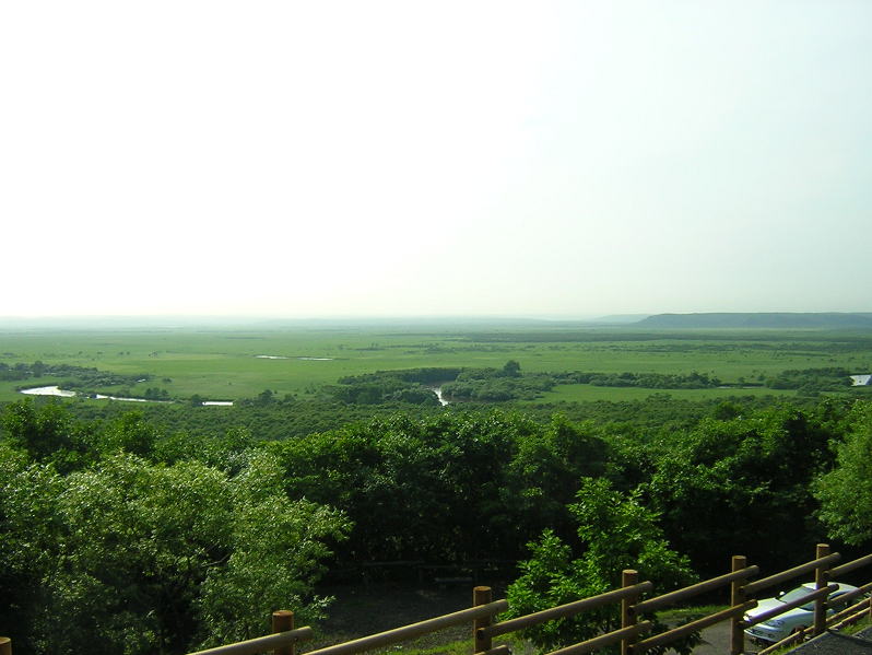 途中の車窓。 地平線が見えそうなほど、草原が広がる。 途中、エゾジカがぽつんと1匹たたずむ姿も見かけた。 |