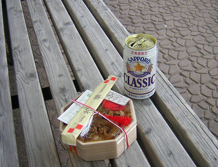 | 昼食は函館駅で買った500円の牛丼と、限定ビール「サッポロクラシック」。 |